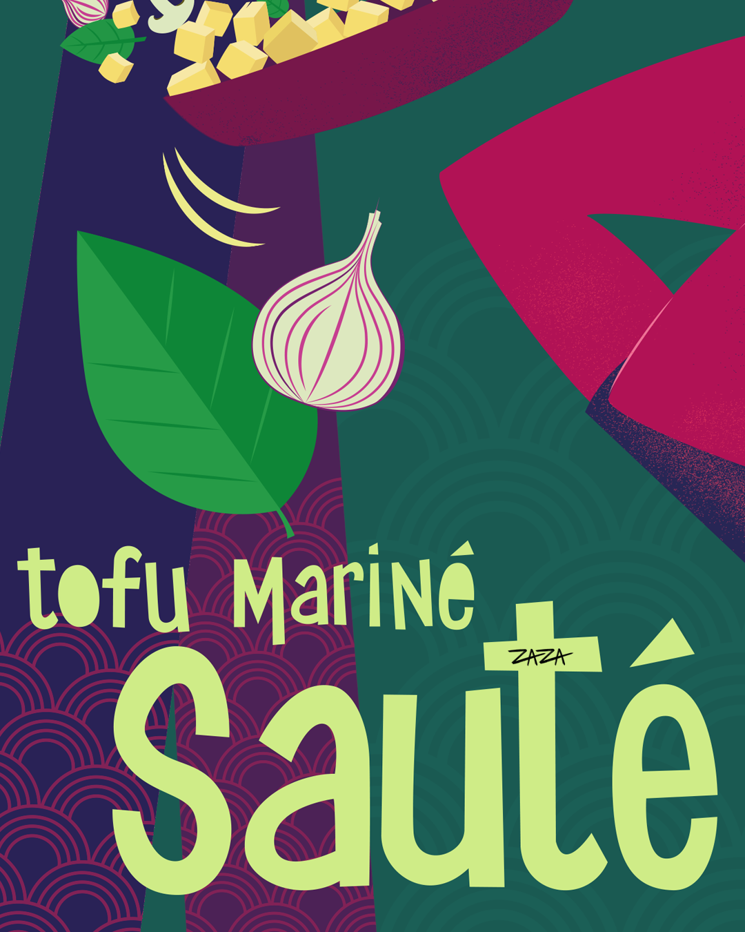 Quand je ne dessine pas, je cuisine (végétal). Et mon tofu mariné, il est super-bon. Alors voilà ma petite recette illustrée pop. Parce que le Tofu mariné et sauté, c’est Pop !